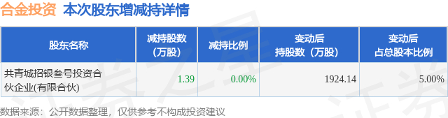 证券之星消息,12月12日合金投资发布公告《合金投资:【2025-067】关于股东减持计划期限届满暨实施情况的公告》,其股东共青城招银叁号投资合伙企业(有限合伙)于2025年11月18日合计减持1.39万股,占公司目前总股本的0.0036%,变动期间该股股价上涨9.95%,截止11月18日收盘报8.29元。