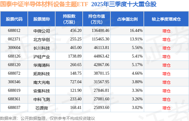 根据2025基金Q3季报公募基金重仓股数据,重仓该股的公募基金共19家,其中持有数量最多的公募基金为国泰基金的国泰中证半导体材料设备主题ETF。国泰中证半导体材料设备主题ETF目前规模为82.99亿元,最新净值1.5262(12月12日),较上一交易日上涨3.78%,近一年上涨39.01%。该公募基金现任基金经理为艾小军。艾小军在任的基金产品包括:国泰金融ETF联接A,管理时间为2014年1月13日至今,期间收益率为173.02%;国泰上证180金融ETF,管理时间为2014年1月13日至今,期间收益率为192.33%;国泰黄金ETF,管理时间为2014年1月13日至今,期间收益率为277.05%;国泰中证计算机主题ETF联接A,管理时间为2015年3月26日至今,期间收益率为-3.1%。