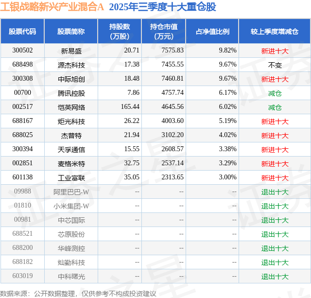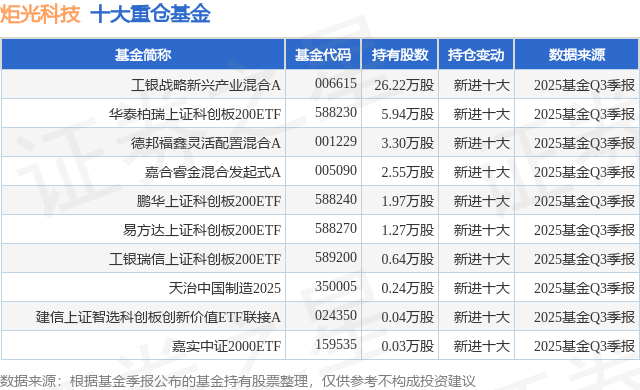 根据2025基金Q3季报公募基金重仓股数据,重仓该股的公募基金共10家,其中持有数量最多的公募基金为工银瑞信基金的工银战略新兴产业混合A。工银战略新兴产业混合A目前规模为5.88亿元,最新净值3.1163(12月12日),较上一交易日上涨2.02%,近一年上涨69.07%。该公募基金现任基金经理为夏雨 马丽娜。夏雨在任的基金产品包括:工银创业板两年定开混合A,管理时间为2021年4月2日至今,期间收益率为10.55%;工银科技创新6个月定开混合A,管理时间为2021年12月7日至今,期间收益率为0.79%。马丽娜在任的基金产品包括:工银创新精选一年定开混合A,管理时间为2022年3月7日至今,期间收益率为52.54%;工银新兴制造混合A,管理时间为2024年7月8日至今,期间收益率为127.7%;工银科技先锋混合发起式A,管理时间为2025年7月15日至今,期间收益率为43.44%。