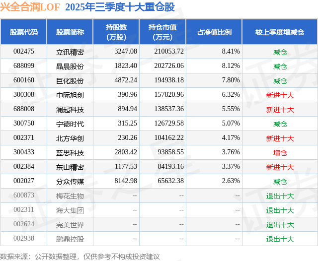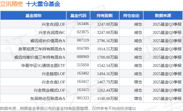 根据2025基金Q3季报公募基金重仓股数据,重仓该股的公募基金共912家,其中持有数量最多的公募基金为兴证全球基金的兴全合润LOF。兴全合润LOF目前规模为249.14亿元,最新净值2.0763(12月12日),较上一交易日上涨1.24%,近一年上涨28.75%。该公募基金现任基金经理为谢治宇。谢治宇在任的基金产品包括:兴全合宜混合(LOF)A,管理时间为2018年1月23日至今,期间收益率为97.18%;兴全社会价值三年持有混合,管理时间为2019年12月26日至今,期间收益率为111.0%;兴全合润混合C,管理时间为2025年4月8日至今,期间收益率为47.71%。