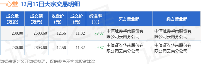 证券之星消息,12月15日一心堂发生大宗交易,交易数据如下: