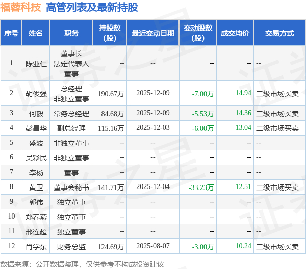证券之星消息,根据12月15日市场公开信息、上市公司公告及交易所披露数据整理,福蓉科技(603327)最新董监高及相关人员股份变动情况:2025年12月12日公司董事,高级管理人员胡俊强共减持公司股份2.1万股,占公司总股本为0.0021%。变动期间公司股价下跌6.87%,12月12日当日收盘报12.75元。