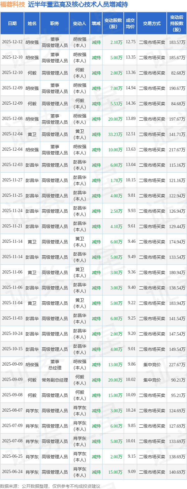 福蓉科技近半年内的董监高及核心技术人员增减持详情如下: