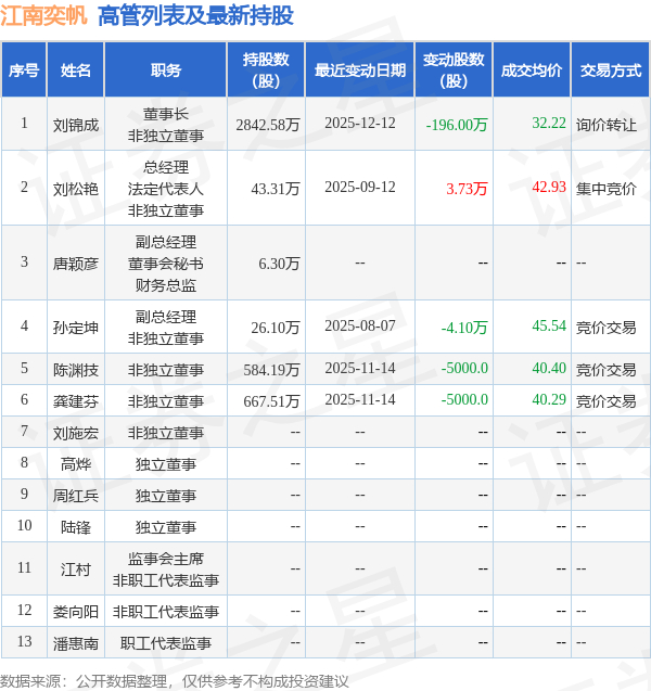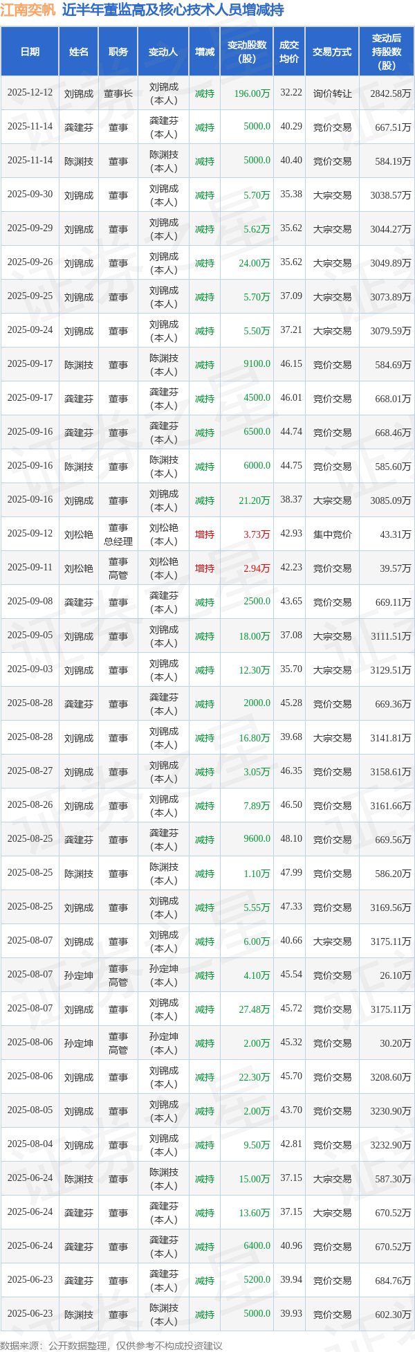 江南奕帆近半年内的董监高及核心技术人员增减持详情如下:
