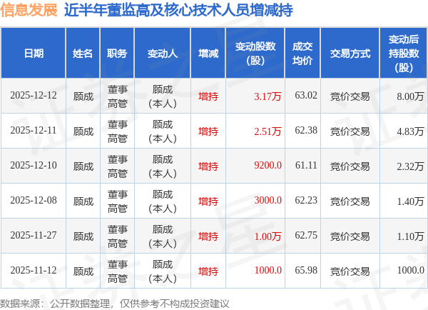 证券之星消息,根据12月15日市场公开信息、上市公司公告及交易所披露数据整理,信息发展(300469)最新董监高及相关人员股份变动情况:2025年12月12日公司董事,高管顾成共增持公司股份3.17万股,占公司总股本为0.0128%。变动期间公司股价上涨1.17%,12月12日当日收盘报62.89元。