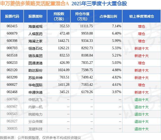 申万菱信多策略灵活配置混合A的前十大重仓股如下: