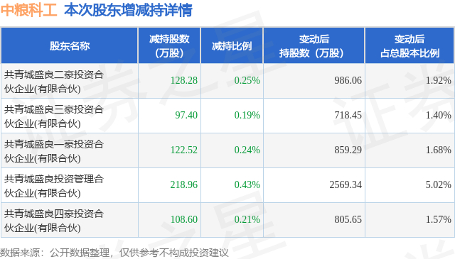 证券之星消息,12月16日中粮科工发布公告《中粮科工:关于持股5%以上股东及其一致行动人权益变动触及1%整数倍的公告》,其股东共青城盛良二豪投资合伙企业(有限合伙)、共青城盛良三豪投资合伙企业(有限合伙)、共青城盛良一豪投资合伙企业(有限合伙)、共青城盛良投资管理合伙企业(有限合伙)、共青城盛良四豪投资合伙企业(有限合伙)于2025年11月4日至2025年12月15日间合计减持675.76万股,占公司目前总股本的1.3191%,变动期间该股股价下跌3.0%,截止12月15日收盘报11.01元。