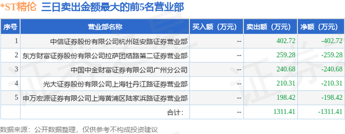 证券之星消息,沪深交易所2025年12月16日公布的交易公开信息显示,*ST精伦(600355)因ST、*ST证券连续三个交易日内收盘价格跌幅偏离值累计达到12%的证券登上龙虎榜。此次是近5个交易日内第1次上榜。
