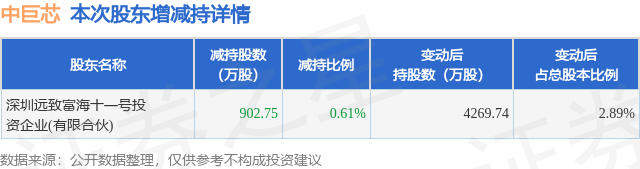 证券之星消息,12月16日中巨芯发布公告《中巨芯:股东减持股份结果公告》,其股东深圳远致富海十一号投资企业(有限合伙)于2025年9月16日至2025年12月15日间合计减持902.75万股,占公司目前总股本的0.6111%,变动期间该股股价上涨7.02%,截止12月15日收盘报9.0元。