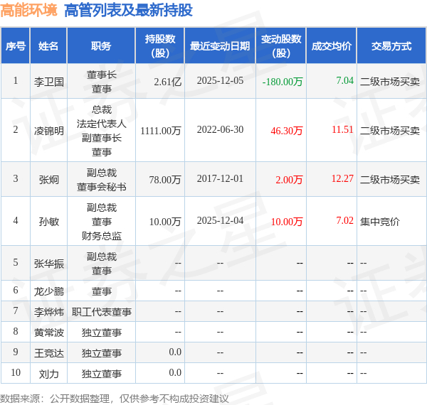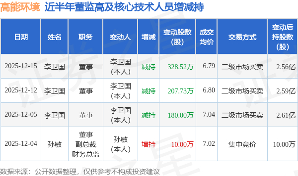 高能环境近半年内的董监高及核心技术人员增减持详情如下: