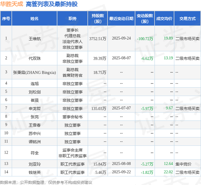 华胜天成近半年内的董监高及核心技术人员增减持详情如下: