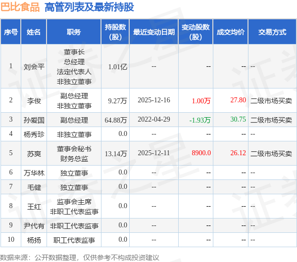 巴比食品的高管列表及最新持股情况如下: