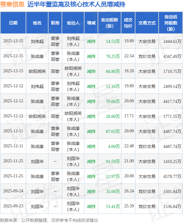 赛意信息近半年内的董监高及核心技术人员增减持详情如下: