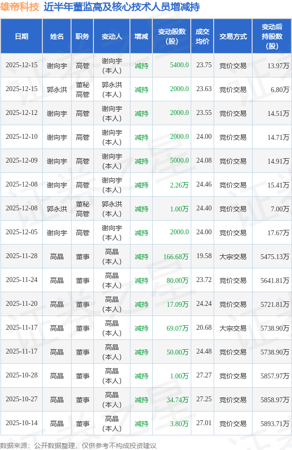 雄帝科技近半年内的董监高及核心技术人员增减持详情如下: