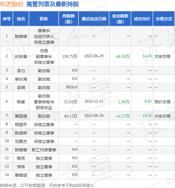 松芝股份近半年内的董监高及核心技术人员增减持详情如下: