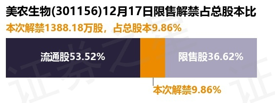 证券之星消息,根据市场公开信息整理,美农生物(301156)于12月17日将有1388.18万股限售股份解禁,为公司追加承诺限售股份上市流通,占公司总股本9.86%。(本次数据根据历史公告整理得出,实际情况以上市公司最新公告为准)最近一年内,该股累计解禁1096.79万股,占总股本的7.79%。本次解禁后,公司还有5155.97万股限售股份,占总股本36.62%。具体如下图所示: