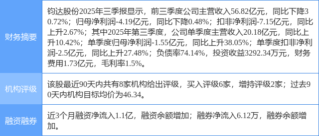今日钧达股份(002865)涨10.01%,收盘报43.31元。