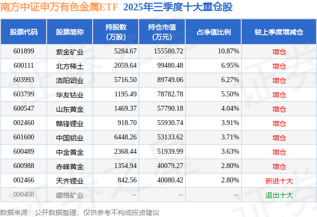 根据2025基金Q3季报公募基金重仓股数据,重仓该股的公募基金共41家,其中持有数量最多的公募基金为南方基金的南方中证申万有色金属ETF。南方中证申万有色金属ETF目前规模为143.16亿元,最新净值1.7158(12月16日),较上一交易日下跌2.63%,近一年上涨69.93%。该公募基金现任基金经理为崔蕾。崔蕾在任的基金产品包括:南方中证申万有色金属ETF发起联接A,管理时间为2019年7月12日至今,期间收益率为171.05%;南方中证1000ETF,管理时间为2019年7月12日至今,期间收益率为73.8%;南方红利低波50ETF,管理时间为2020年1月17日至今,期间收益率为94.28%。