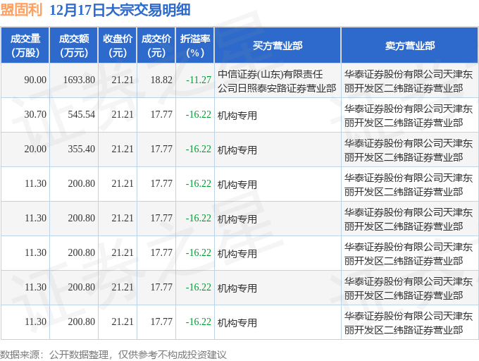 证券之星消息,12月17日盟固利发生大宗交易,交易数据如下: