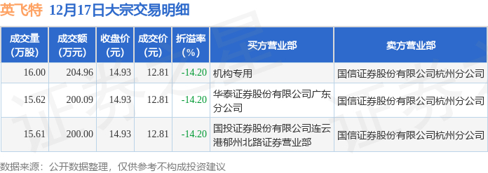 证券之星消息,12月17日英飞特发生大宗交易,交易数据如下: