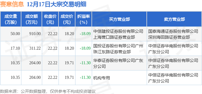 证券之星消息,12月17日赛意信息发生大宗交易,交易数据如下: