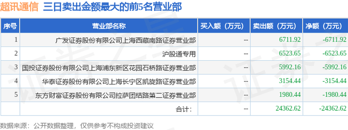 证券之星消息,沪深交易所2025年12月17日公布的交易公开信息显示,超讯通信(603322)因有价格涨跌幅限制的日收盘价格跌幅偏离值达到7%的前五只证券,非ST、*ST和S证券连续三个交易日内收盘价格跌幅偏离值累计达到20%的证券登上龙虎榜。此次是近5个交易日内第1次上榜。