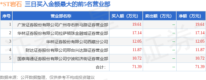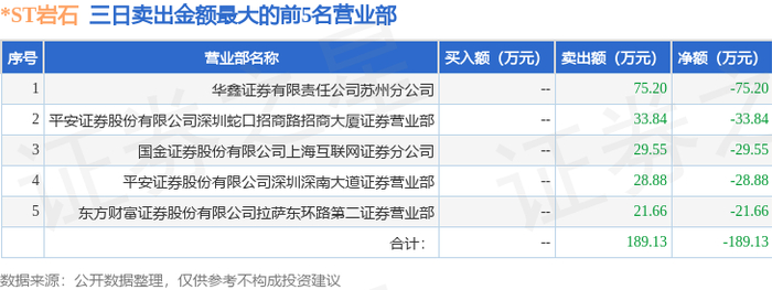 证券之星消息,沪深交易所2025年12月17日公布的交易公开信息显示,*ST岩石(600696)因ST、*ST证券连续三个交易日内收盘价格跌幅偏离值累计达到12%的证券登上龙虎榜。此次是近5个交易日内第2次上榜。