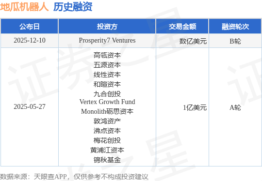 证券之星消息,根据天眼查APP于12月10日公布的信息整理,深圳地瓜机器人有限公司B轮融资,融资额数亿美元,参与投资的机构包括Prosperity7 Ventures。
