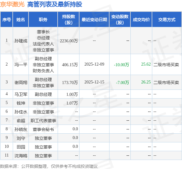 京华激光近半年内的董监高及核心技术人员增减持详情如下: