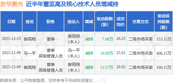 证券之星消息,根据12月17日市场公开信息、上市公司公告及交易所披露数据整理,京华激光(603607)最新董监高及相关人员股份变动情况:2025年12月9日至2025年12月15日公司董事,高级管理人员冯一平、董事谢高翔、董事,高级管理人员谢高翔共减持公司股份30.57万股,占公司总股本为0.1712%。变动期间公司股价上涨3.23%,12月15日当日收盘报26.22元。