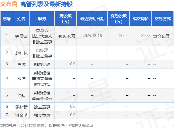 证券之星消息,根据12月17日市场公开信息、上市公司公告及交易所披露数据整理,艾布鲁(301259)最新董监高及相关人员股份变动情况:2025年12月16日公司董事钟儒波共减持公司股份200.0股,占公司总股本为0.0001%。变动期间公司股价下跌0.71%,12月16日当日收盘报32.33元。