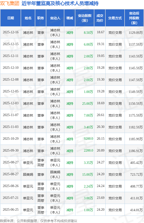 双飞集团近半年内的董监高及核心技术人员增减持详情如下: