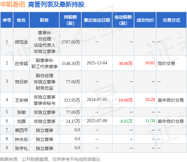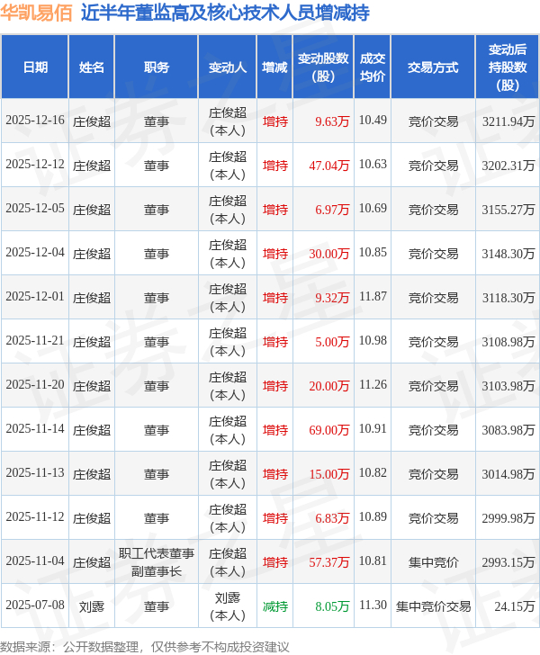 华凯易佰近半年内的董监高及核心技术人员增减持详情如下: