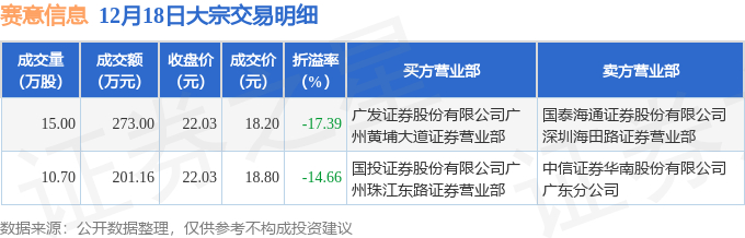证券之星消息,12月18日赛意信息发生大宗交易,交易数据如下:
