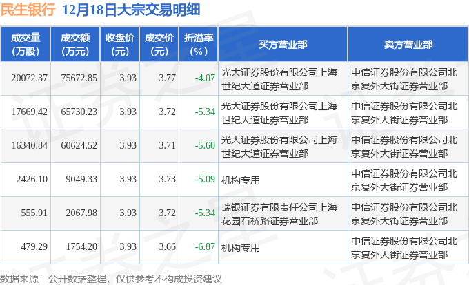 证券之星消息,12月18日民生银行发生大宗交易,交易数据如下: