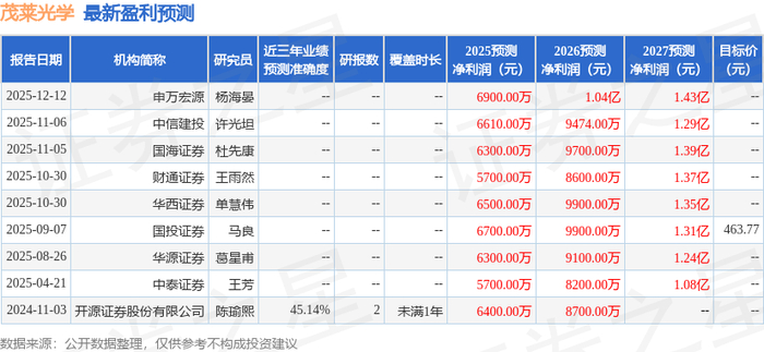 中国银河证券股份有限公司高峰,钟宇佳近期对茂莱光学进行研究并发布了研究报告《破局工业级精密光学,卡位高增长赛道》,首次覆盖茂莱光学给予买入评级,目标价469.94元。