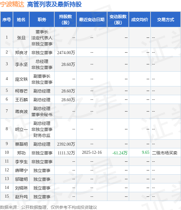 宁波精达近半年内的董监高及核心技术人员增减持详情如下: