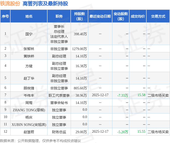 铁流股份的高管列表及最新持股情况如下: