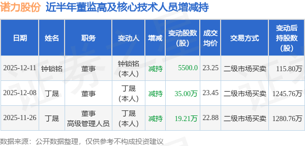 证券之星消息,根据12月18日市场公开信息、上市公司公告及交易所披露数据整理,诺力股份(603611)最新董监高及相关人员股份变动情况:2025年12月11日公司董事钟锁铭共减持公司股份5500.0股,占公司总股本为0.0021%。变动期间公司股价下跌0.86%,12月11日当日收盘报23.05元。