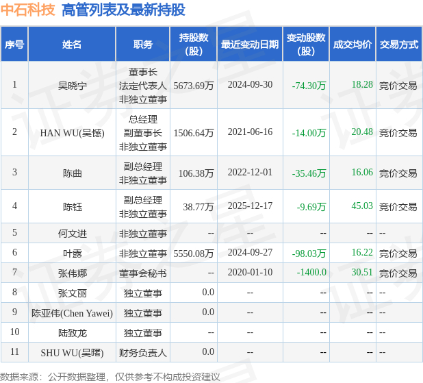 中石科技近半年内的董监高及核心技术人员增减持详情如下: