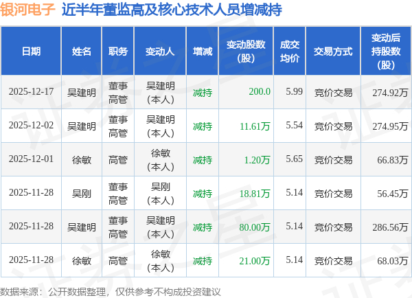 银河电子近半年内的董监高及核心技术人员增减持详情如下: