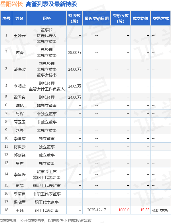 证券之星消息,根据12月18日市场公开信息、上市公司公告及交易所披露数据整理,岳阳兴长(000819)最新董监高及相关人员股份变动情况:2025年12月17日公司监事王珏共增持公司股份1000.0股,占公司总股本为0.0003%。变动期间公司股价上涨1.56%,12月17日当日收盘报15.66元。