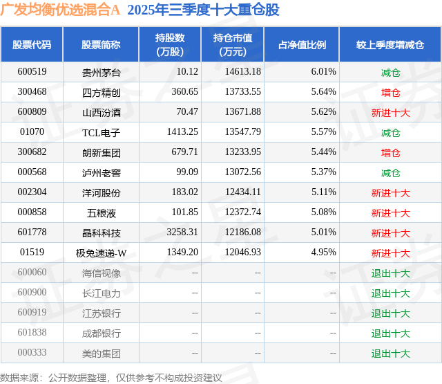 根据2025基金Q3季报公募基金重仓股数据,重仓该股的公募基金共9家,其中持有数量最多的公募基金为广发基金的广发均衡优选混合A。广发均衡优选混合A目前规模为22.82亿元,最新净值0.9013(12月18日),较上一交易日下跌0.39%,近一年下跌12.71%。该公募基金现任基金经理为王明旭。王明旭在任的基金产品包括:广发内需增长混合A,管理时间为2018年10月17日至今,期间收益率为117.74%;广发价值优势混合,管理时间为2020年3月2日至今,期间收益率为23.94%;广发稳健优选六个月持有期混合A,管理时间为2020年8月6日至今,期间收益率为-1.72%;