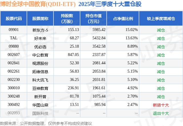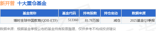 根据2025基金Q3季报公募基金重仓股数据,重仓该股的公募基金共1家,其中持有数量最多的公募基金为博时基金的博时全球中国教育(QDII-ETF)。博时全球中国教育(QDII-ETF)目前规模为3.98亿元,最新净值0.533(12月17日),较上一交易日上涨0.53%,近一年上涨2.05%。该公募基金现任基金经理为万琼。万琼在任的基金产品包括:博时标普500ETF联接A,管理时间为2015年10月8日至今,期间收益率为269.44%;博时标普500ETF,管理时间为2015年10月8日至今,期间收益率为305.07%;博时中证500ETF,管理时间为2019年8月1日至今,期间收益率为78.34%;博时中证500ETF联接A,管理时间为2019年12月30日至今,期间收益率为64.48%。
