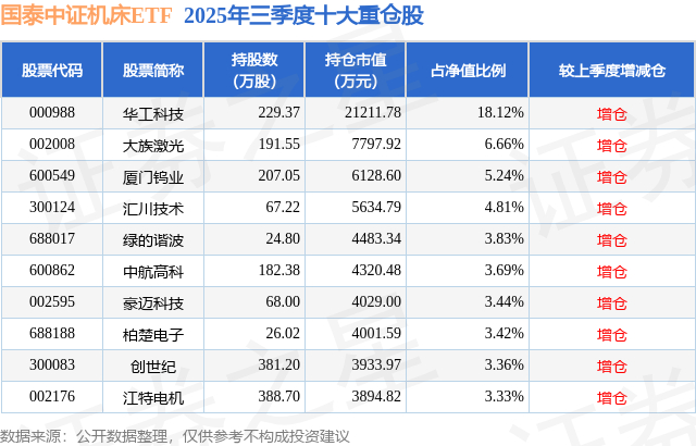 根据2025基金Q3季报公募基金重仓股数据,重仓该股的公募基金共6家,其中持有数量最多的公募基金为国泰基金的国泰中证机床ETF。国泰中证机床ETF目前规模为11.7亿元,最新净值1.4557(12月18日),较上一交易日下跌1.67%,近一年上涨43.39%。该公募基金现任基金经理为苗梦羽。苗梦羽在任的基金产品包括:国泰中证全指软件ETF联接A,管理时间为2021年9月28日至今,期间收益率为-11.12%;国泰中证全指软件ETF,管理时间为2021年9月28日至今,期间收益率为-11.94%;国泰中证基建ETF,管理时间为2022年2月9日至今,期间收益率为4.11%;国泰中证港股通科技ETF发起联接A,管理时间为2022年6月7日至今,期间收益率为20.64%。