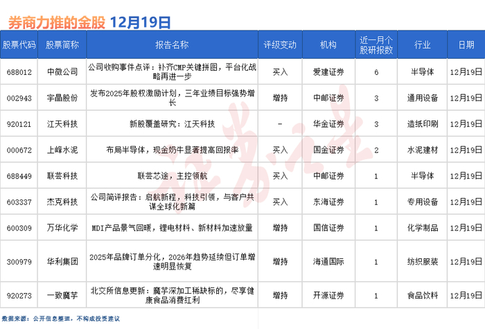 中微公司最受券商关注,近一个月获中邮证券、爱建证券、华安证券、东海证券等6份券商研报关注,仅12月19日就有爱建证券和东吴证券等两份券商研报,位居12月19日券商力推股榜首。