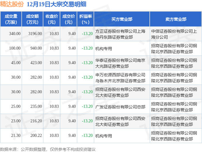 证券之星消息,12月19日精达股份发生大宗交易,交易数据如下: