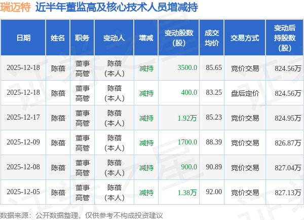 证券之星消息,根据12月19日市场公开信息、上市公司公告及交易所披露数据整理,瑞迈特(301367)最新董监高及相关人员股份变动情况:2025年12月18日公司董事,高管陈蓓共减持公司股份3900.0股,占公司总股本为0.0043%。变动期间公司股价下跌2.39%,12月18日当日收盘报83.25元。