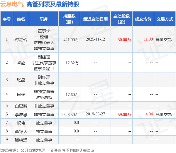 云意电气的高管列表及最新持股情况如下: