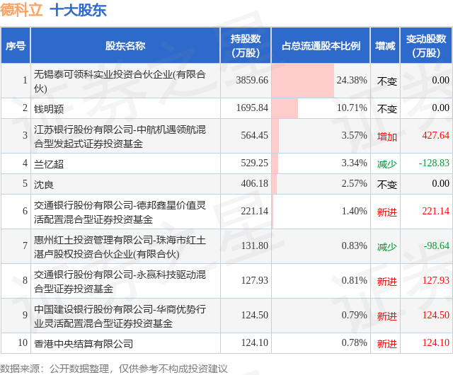 证券之星消息,12月22日德科立发布公告《德科立:无锡市德科立光电子技术股份有限公司持股5%以上股东及其一致行动人减持股份结果公告》,其股东沈良于2025年11月22日至2025年12月22日间合计减持63.84万股,占公司目前总股本的0.4033%,变动期间该股股价上涨34.01%,截止12月22日收盘报154.11元。